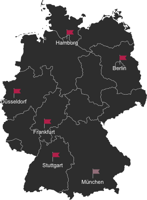 Für Sie sind wir bundesweit in folgenden Städten und Umgebung tätig: Hamburg, Berlin, Düsseldorf, Frankfurt am Main, Stuttgart und München.